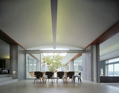 The spatial arrangement is defined by a series of repetitive concrete columns, which in turn carry the parallel vaults. The columns and vaults divide the spaces maintaining the flowing open plan. Sliding doors and walls are contained between the paired columns and these connect or enclose the spaces, as they are required. This additive construction principal creates the residence’s dominant architectural expression.